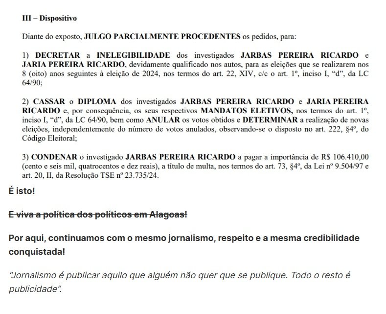 Além da cassação dos diplomas, foi aplicada a sanção de inelegibilidade do prefeito e da vice, nos termos da legislação eleitoral vigente. Sob o sepulcral silêncio da Câmara de Vereadores, que tem negociado a indicação do futuro vice-prefeito nas eleições de 2028, a decisão requer recurso e o prefeito, na tentativa de contornar o impacto da decisão judicial, gravou um vídeo e postou em sua rede social, “menosprezando” a denúncia e afirmando sua inocência.