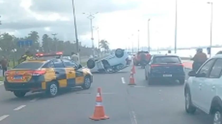 Um carro capotou na manhã desta terça-feira (5) na Avenida Assis Chateaubriand, em Maceió, e ficou com as rodas para cima, causando lentidão no trânsito da região. O condutor seguia em um Fiat Palio branco no sentido Marechal Deodoro/Maceió quando perdeu o controle da direção e o veículo virou.